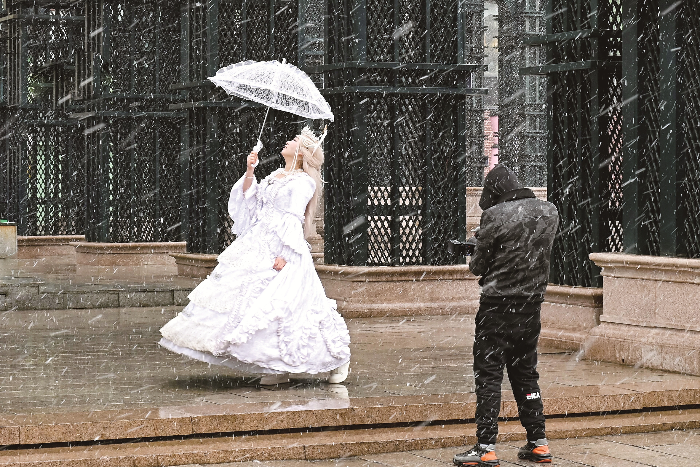 3月26日,在哈尔滨建筑艺术广场,人们在雪中拍照。 新华社发(原勇 摄)