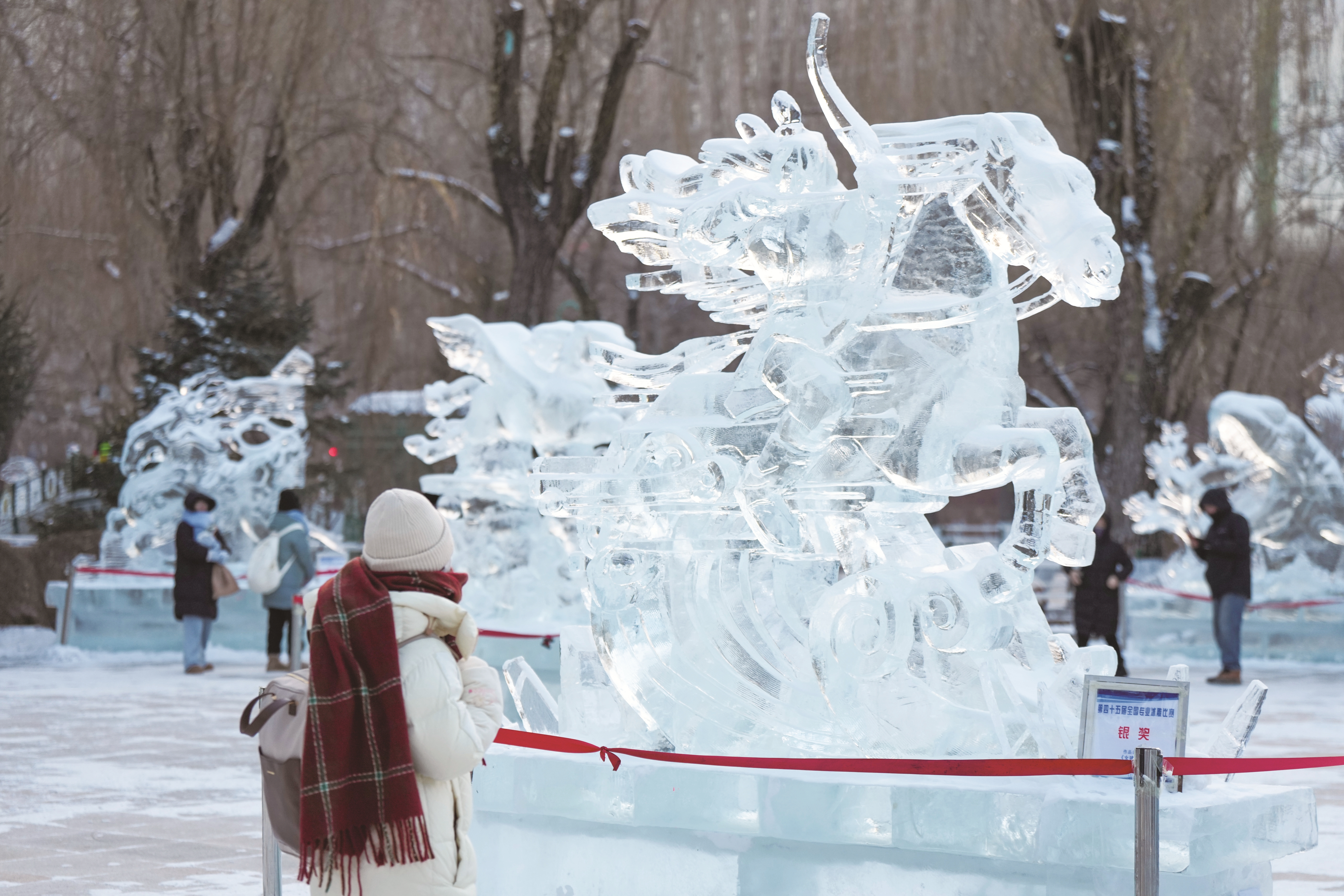 游客在哈尔滨市兆麟公园举办的第52届哈尔滨冰灯艺术游园会上欣赏冰雕作品(1月14日摄)。 入冬以来,在哈尔滨市兆麟公园举办的第52届哈尔滨冰灯艺术游园会吸引众多游客和市民前来参观游览。游园会建设用冰量约2300立方米,用雪量约800立方米,采用“一轴六区”空间布局,打造了超过300处冰雪雕景观。 新华社记者王松 摄