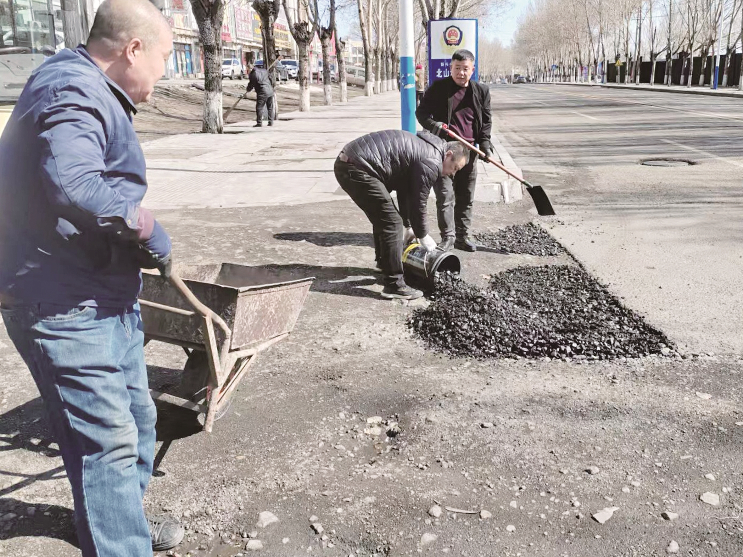 工作人员修缮路面。